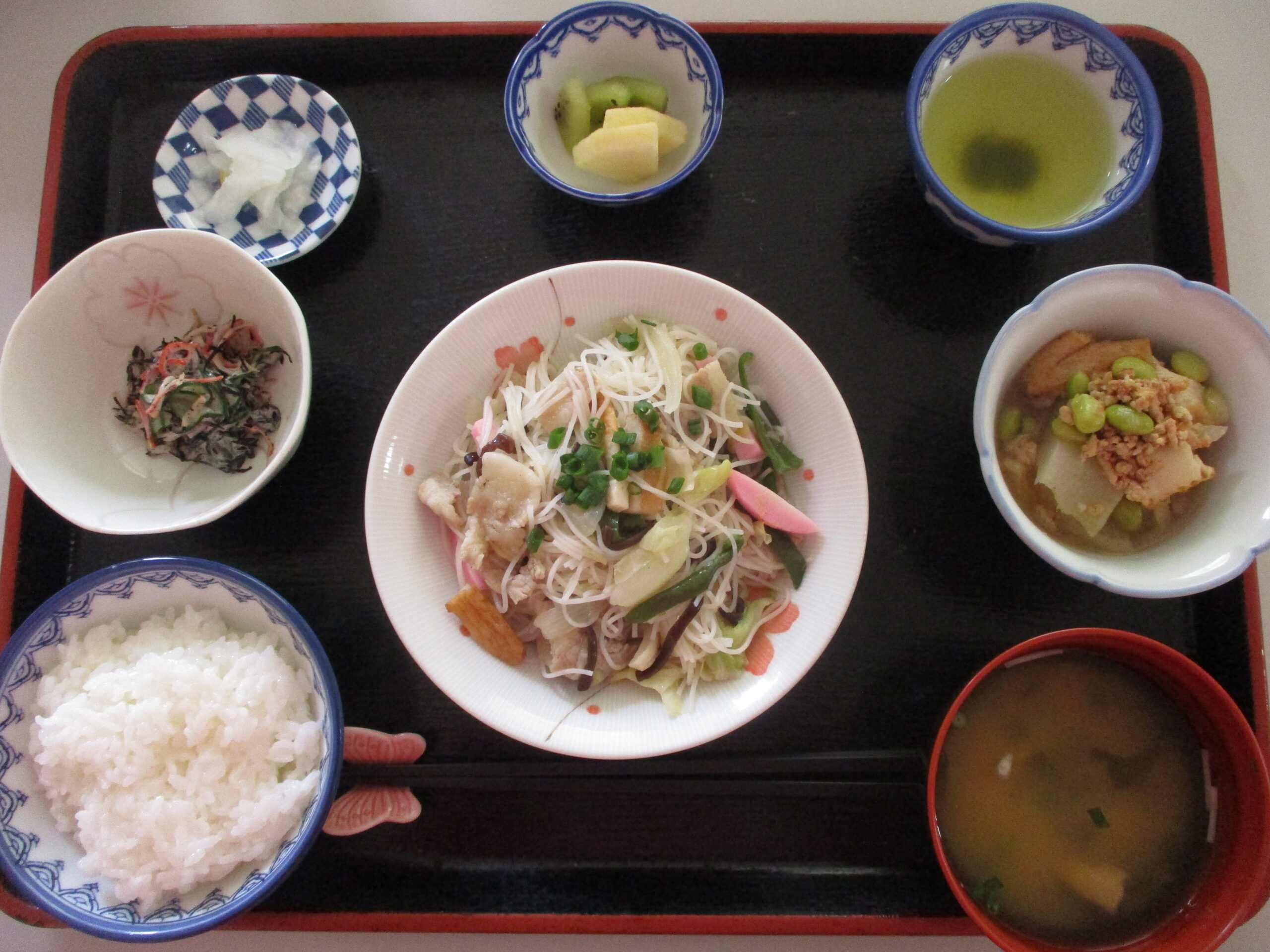 (ビーフン、豚肉、キャベツ、ピーマン、人参、きくらげ、角天、竹輪、蒲鉾、葱)