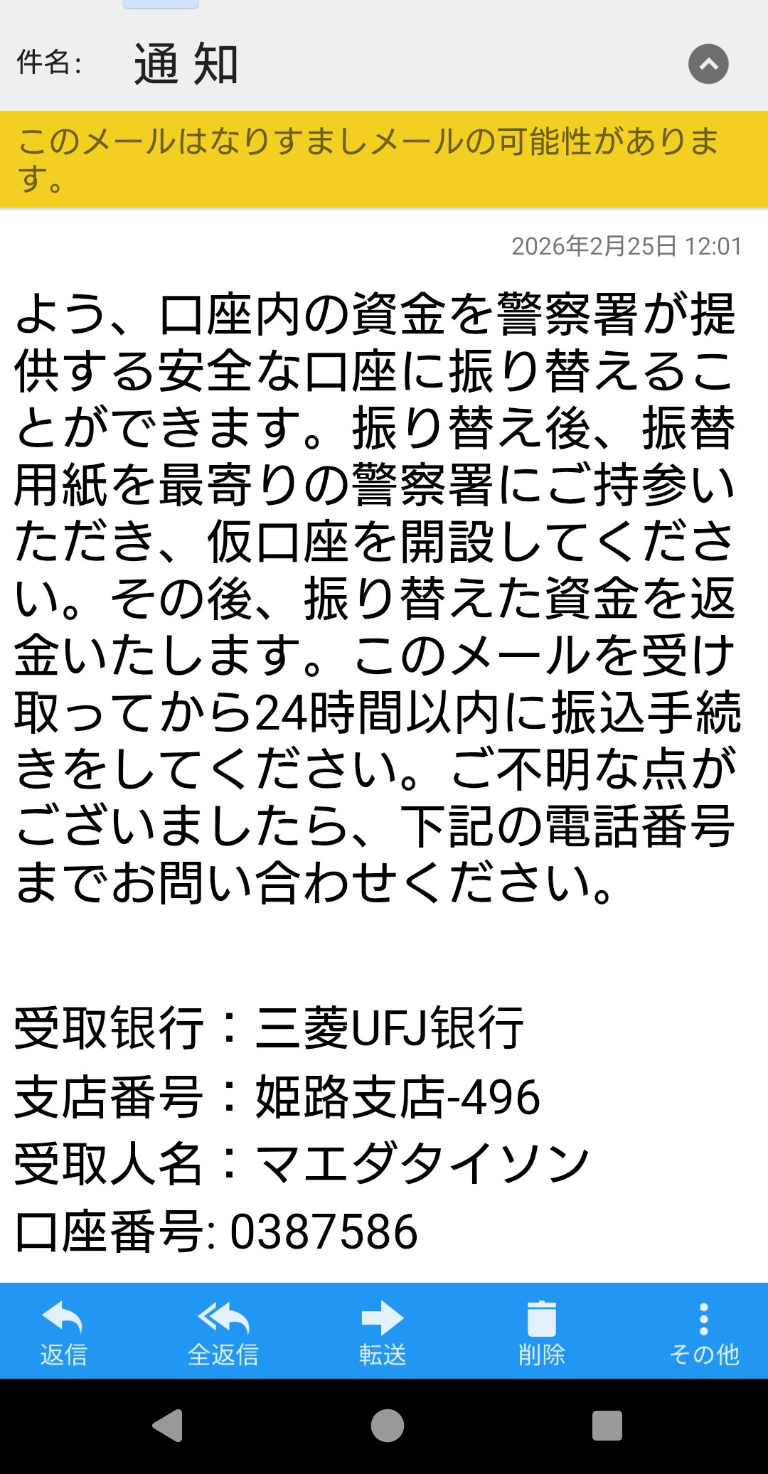 私の銀行口座がマネーロンダリングに使われているので、凍結されるから、安全なこの口座にお金を移してほしいとのことでした。