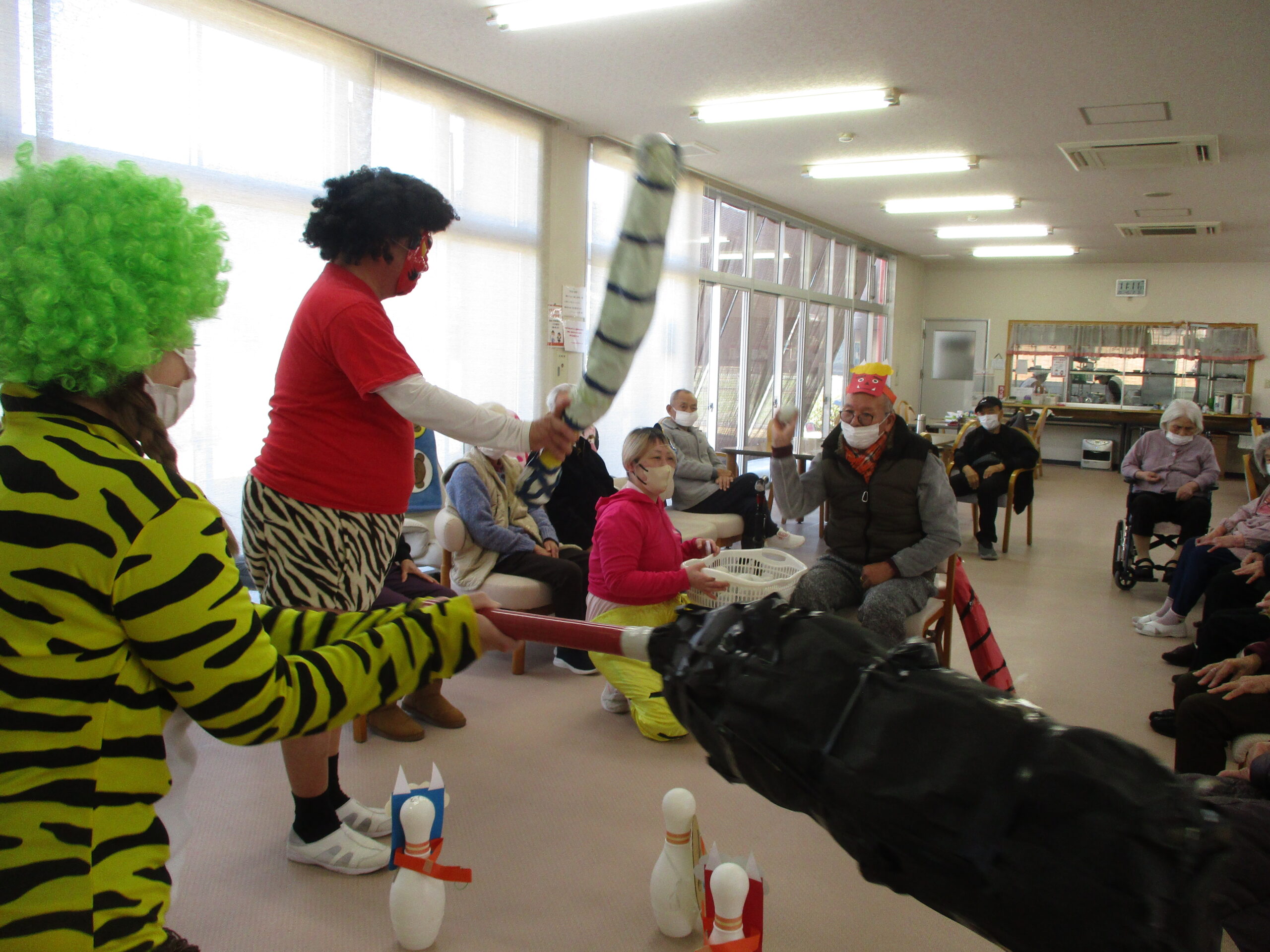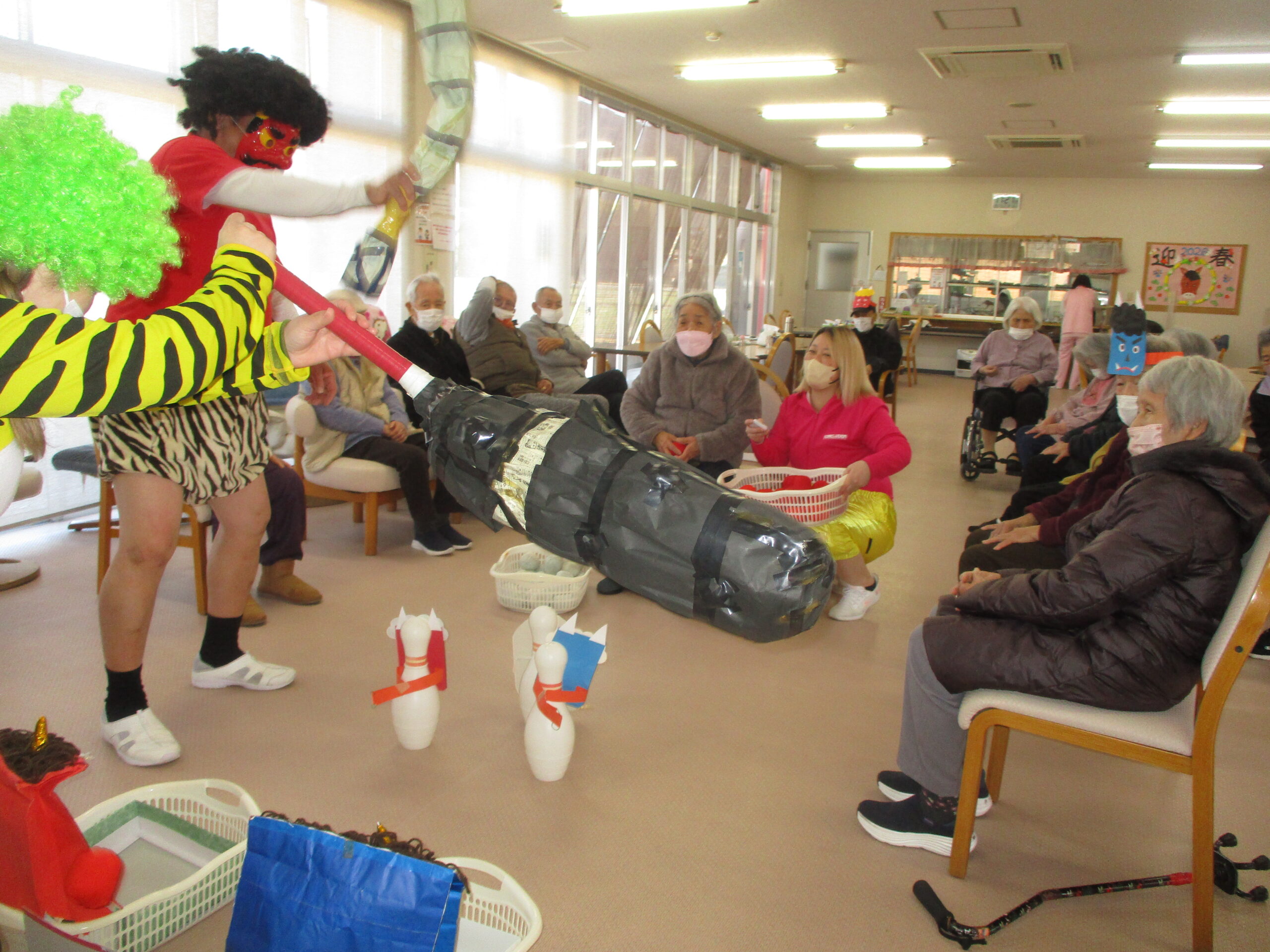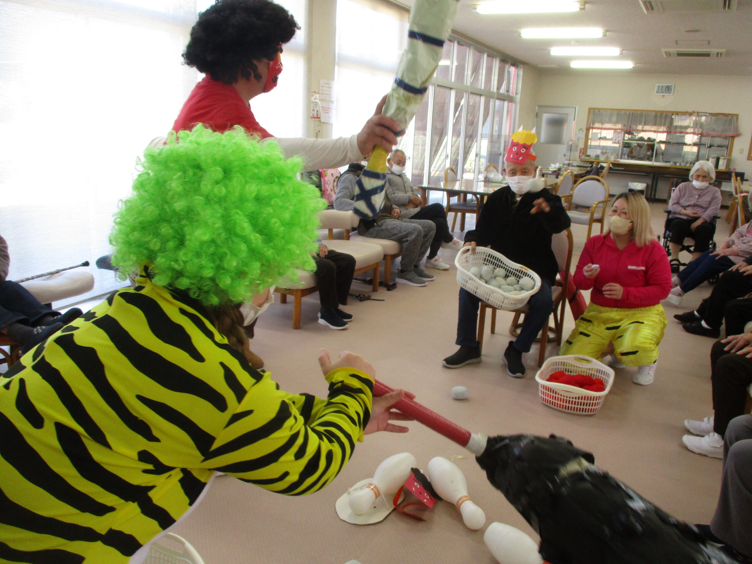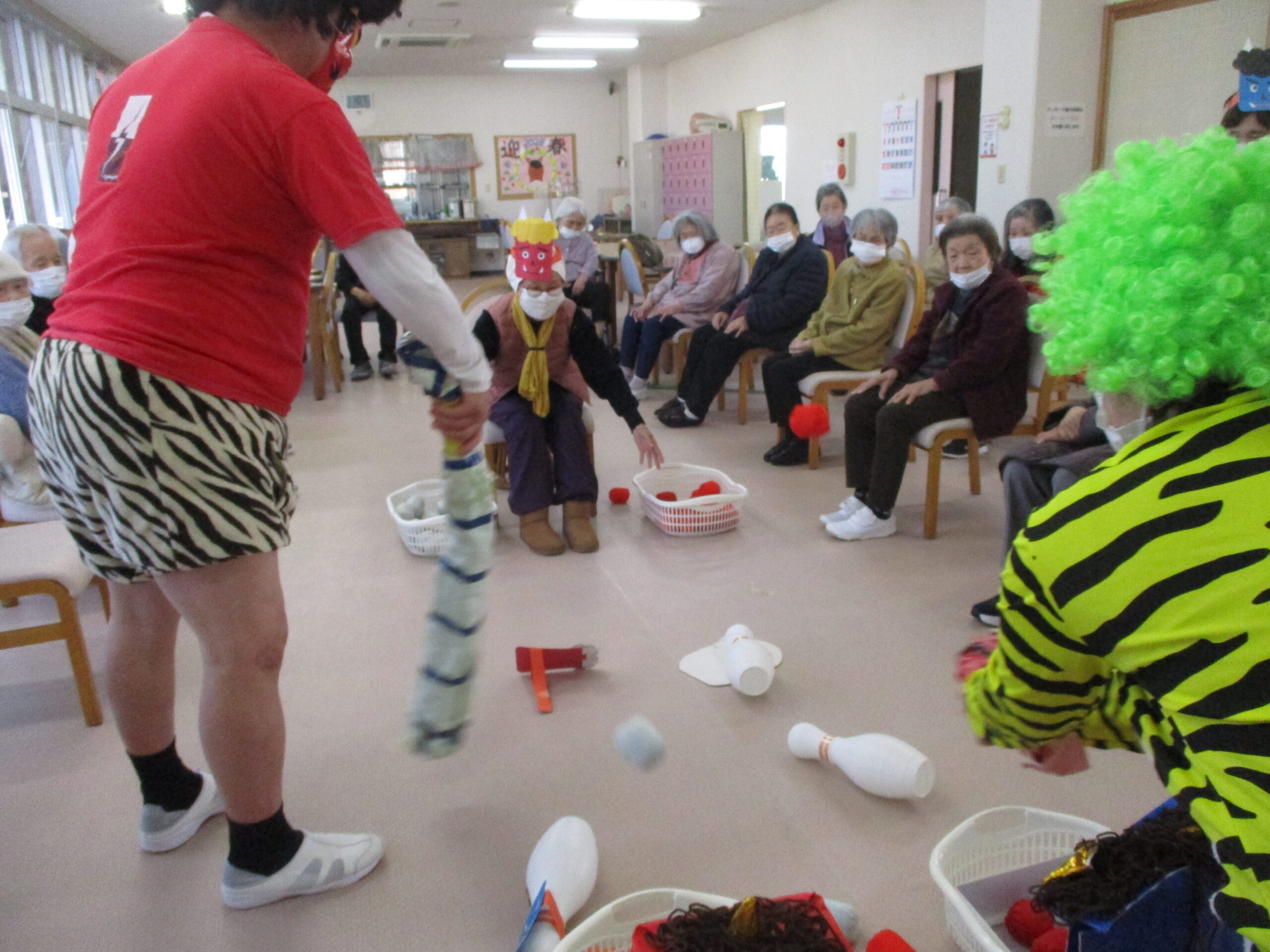 今日は節分でレクレーションでは職員は鬼に扮しています。